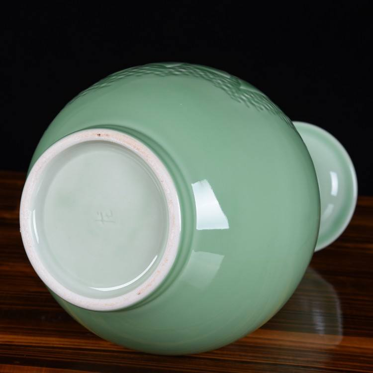 Celadon ornament set, antique Chinese style shelf decoration, carved peony, jade pot, spring bottle, transparent
