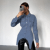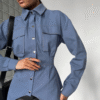 3 reviews for Cut-Out Irregular Hem Designs Waist Slim Blue Streetwear Tops Double Pockets Button Down Long Sleeve Shirt for Women