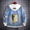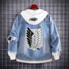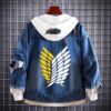 Distressed Denim Jacket with Lapel Buttons Anime Men’s Hooded Denim Jacket Attack on Titan Denim Sweatshirt