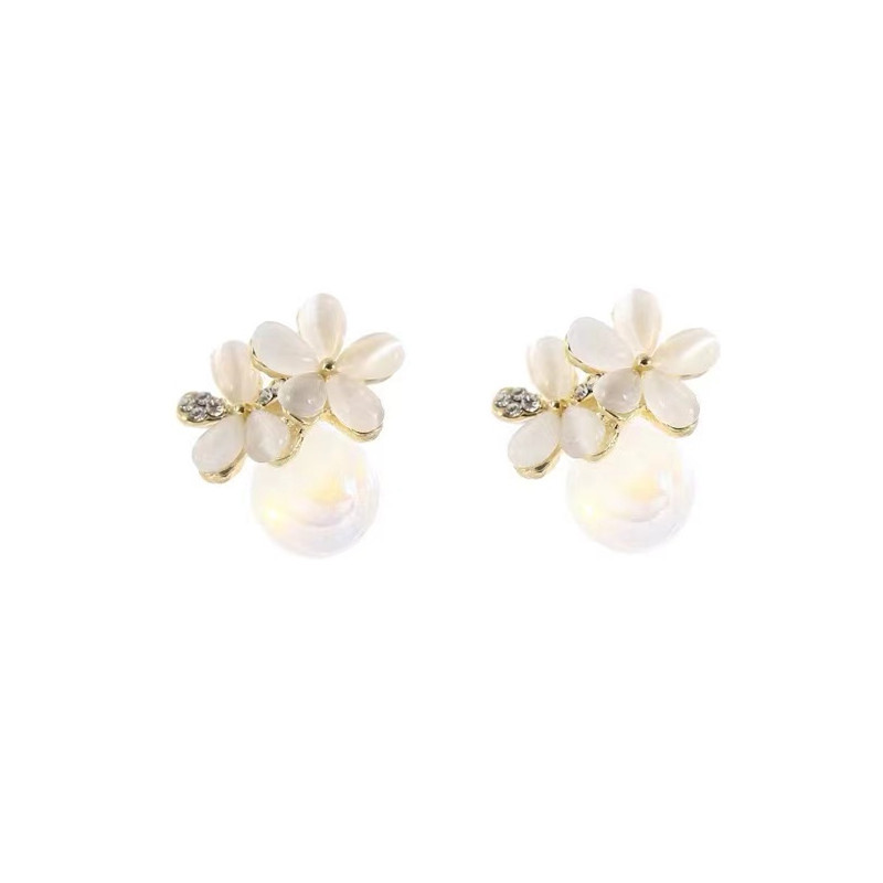 Korean version of light luxury mermaid girl pearl flower earrings with niche design and high-end cat eye stone earrings and earrings