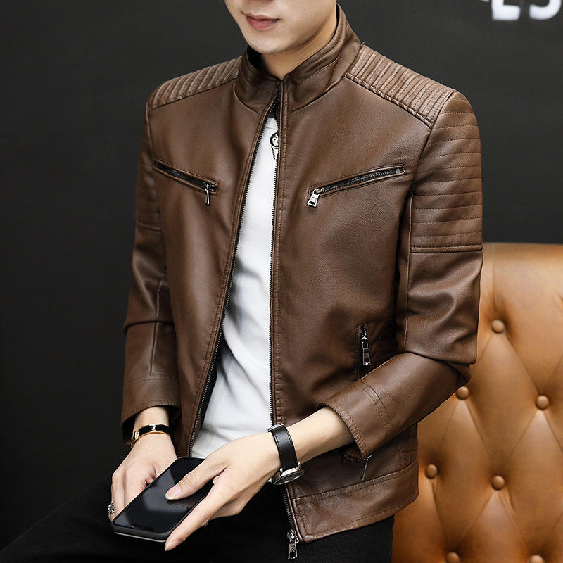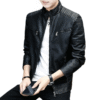 Fashion Men Clothing Stand Collar PU Faux Leather Motorcycle Jacket Slim Fit Causal Coat
