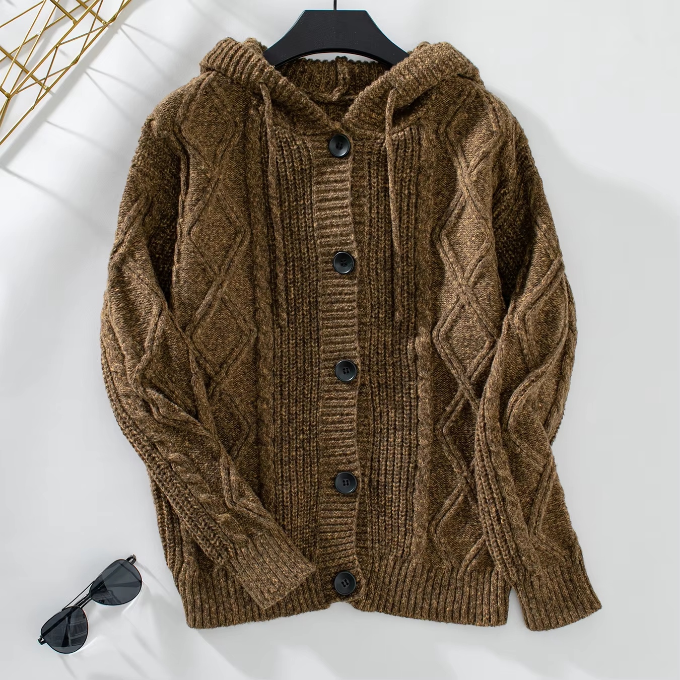 1 review for Hooded Drawstring Knit Cardigan Autumn and Winter New Twist Sweater Women’s Solid Color Medium Long Coat