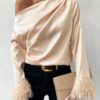 1 review for Long Sleeve Stain Silk Blouses Off Shoulder Women’s Blouses Shirts Fuzzy Cuff Asymmetrical Neck Fitted Satin Blouse