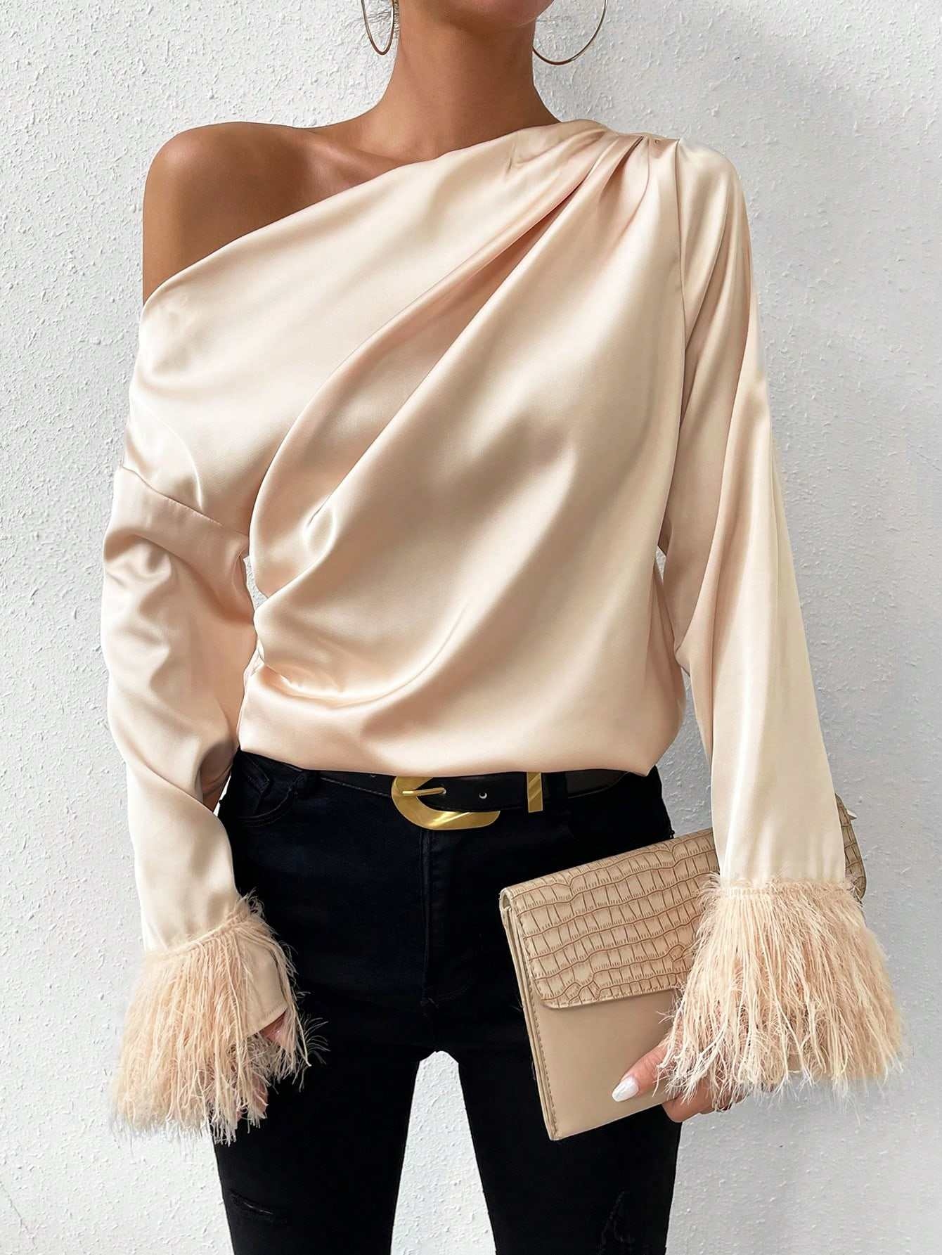 Long Sleeve Stain Silk Blouses Off Shoulder Women’s Blouses Shirts Fuzzy Cuff Asymmetrical Neck Fitted Satin Blouse