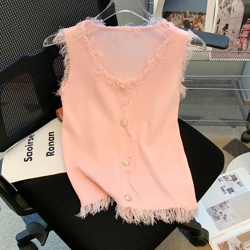 Summer Chic Fringed Hem Knitted Vest Slim Fit Sleeveless Tank Top Women’s Breathable Casual T-Shirt Single-breasted Chic Top