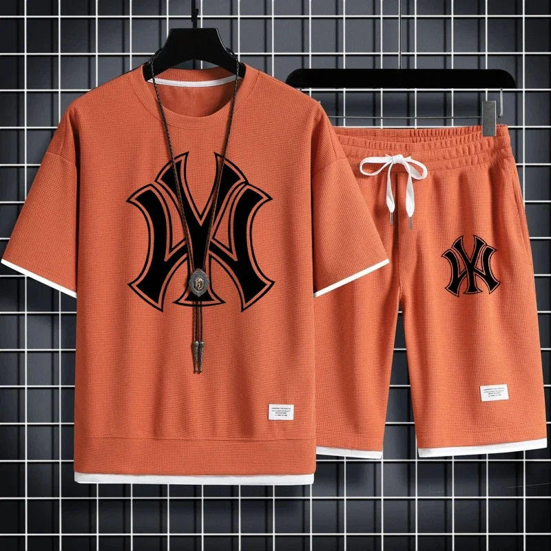 Summer Fashion Men’s Waffle Short Sleeve Set+Sports Pants 2-piece Set with Comfortable Texture and Fabric