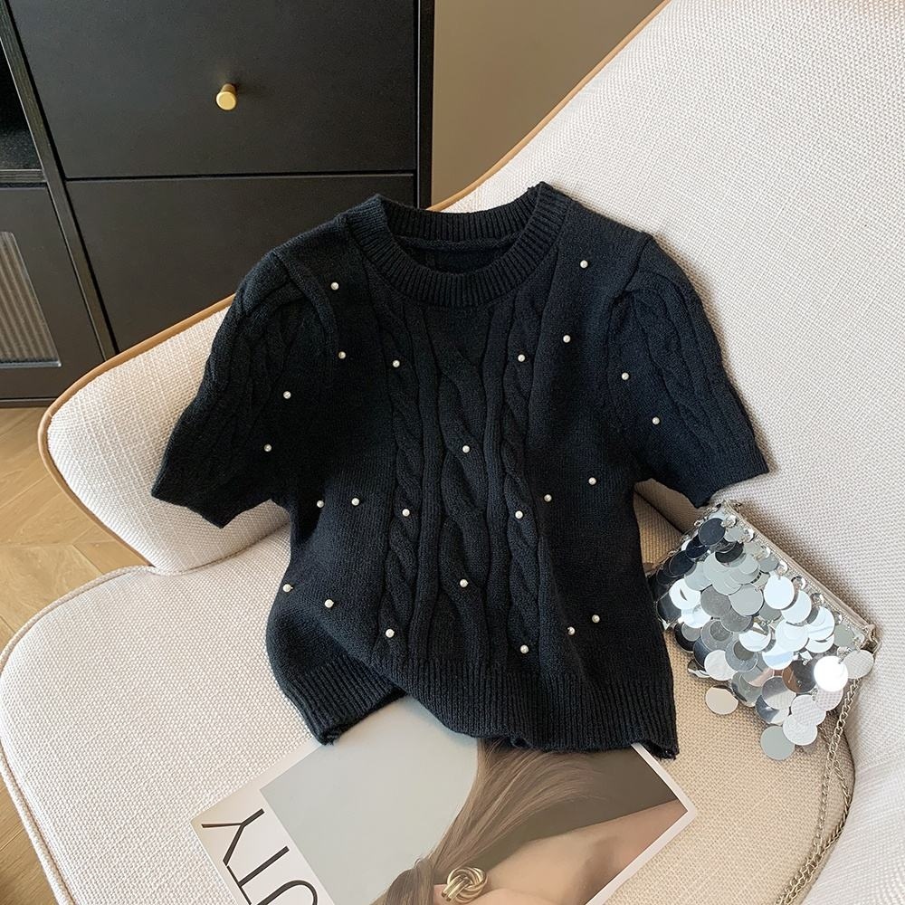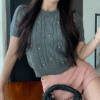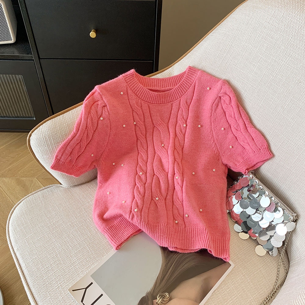Women’s Vintage Knit Sweater Autumn Beaded O-Neck Short Sleeve Casual Pullover Elegant Solid Versatile Top Chic Short Sweater